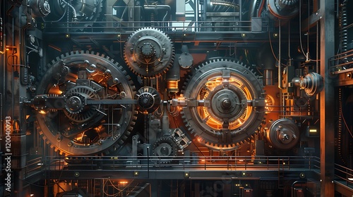 Industrial gears machinery, factory interior, intricate mechanism, glowing parts, energy
