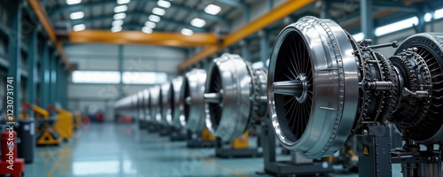 Industrial hangar displays advanced machinery manufacturing airplane engines. Rows of complex engine parts in high-tech workshop. Precision engineering, automation crucial in aerospace production