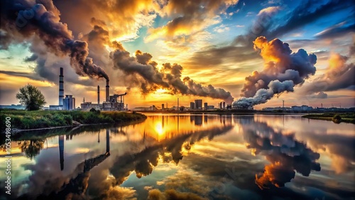 Industrial Landscape with Factories Emitting Smoke, Reflections on Water, Dramatic Sunset Sky, Documentary Photography, Environmental Impact, Urban Scene, Pollution Awareness