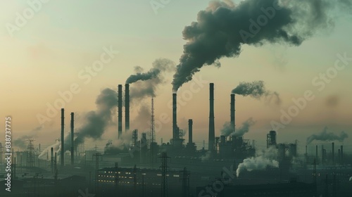 Industrial landscape with towering smokestacks and heavy emissions, representing the future of carbon capture technology.