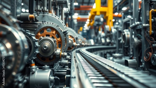 gear, conveyer belt, factory, machinery, engineering, photo, industrial design, manufacturing, metalwork, automation, technology, factory, mechanical, production, detail, bright, sharp, lighting, professional, high-quality, heavy machinery
