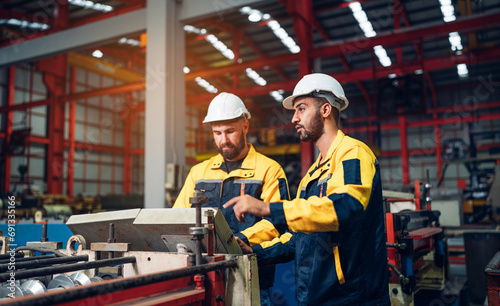 Industrial man engineer wear uniform working and checking system machine at factory. Workers industrial factory. Machine maintenance technician operation concept.