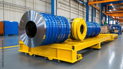 industrial, factory, metal, part, machinery, manufacturing, blue, silver, yellow, cart, component, stack, setting, production, process, equipment, heavy, industry, steel, floor, background, scene, workplace, plant, image, metalwork, machine, photo, fabrication, design, technology, engineering, mechanic, workshop, assembly, line, warehouse