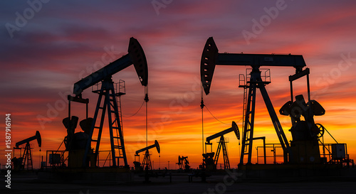 Industrial oil pump jacks working in a desert oil field. Large mechanical oil extraction machines used for crude oil production. Concept of energy industry, petroleum engineering, fossil fuels, and na