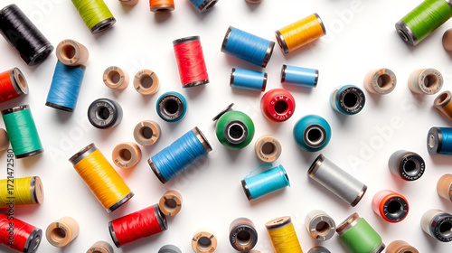 Industrial Sewing machine bobbins isolated on white background arranged in abstract and random order neat colorful playful