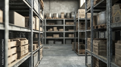 Industrial Warehouse Storage: Rows of Metal Shelving Filled with Cardboard Boxes and Wooden Crates