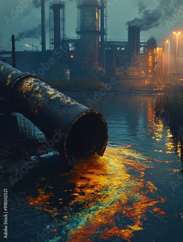 pollution, industrial, discharge, urban, pipe, contamination, environment, factory, city landscape, dusk, stream, toxic, runoff, ecosystem, hazard, manufacturing, effluent, drainage, sewage, disposal, outflow, dumping, ecological, impact, glow, luminescent, fluid, canal, rust, metal, decay, abandoned, atmospheric, moody, waste, chemical, water, city, industry, evening, twilight, smog, haze, foggy, misty, eerie, ominous