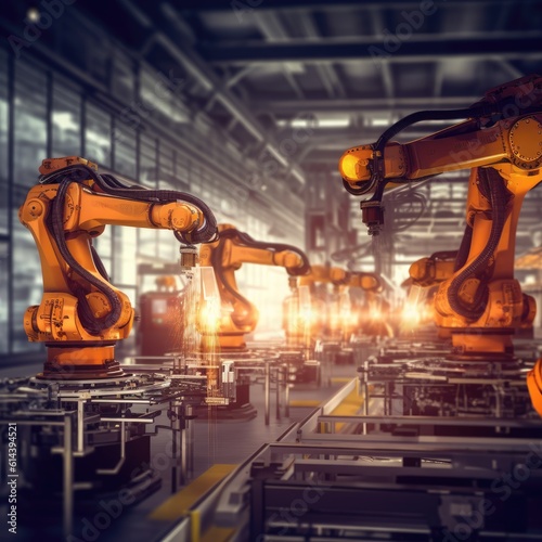 Industrial welding robots in the production line of a manufacturer's plant. Generative AI