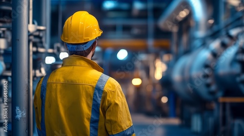 Industrial Worker In Yellow Safety Suit Looking At Machinery In Factory