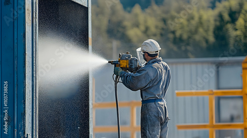 Industrial Worker Spray Painting Metal Surface Outdoors, Protective Gear, Precise Application, Efficient Technique