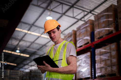 Industry warehouse worker in safety uniform check order details and checking goods supplies on boxes shelve in workplace warehouse industry logistic export import distribution business concept.