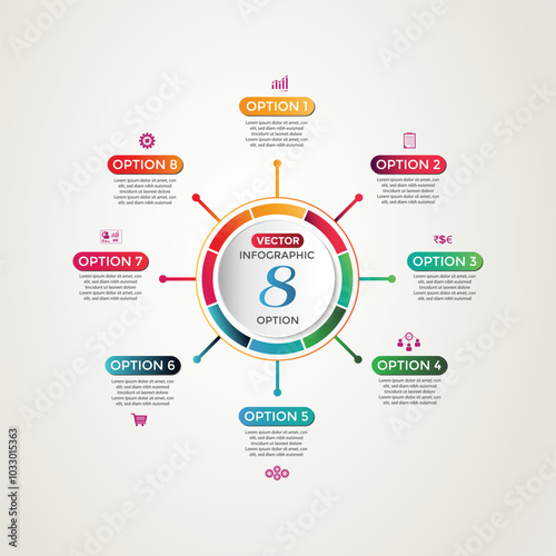 Infographic circular diagram with 8 options, designed as a round chart ideal for business analytics, data visualization, and presentations. vector-style illustration for a clean and professional look