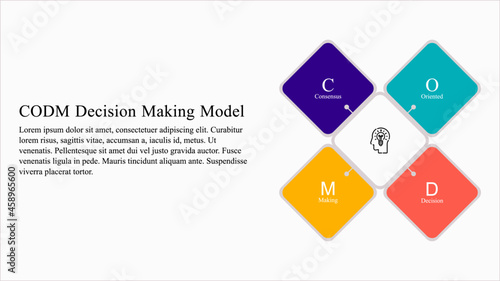 Infographic presentation template of consensus-oriented decision-making model (CODM) that helps to make better decisions while working in a team or in a group.