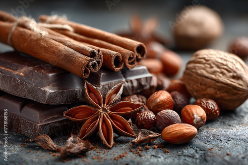 Ingredients for Christmas baking - chocolate, cinnamon, anise and nuts on a stone or slate background. Seasonal, food background.