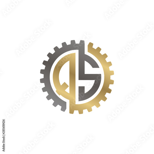 Initial letter Q and S, QS, interlock cogwheel gear logo, black gold on white background