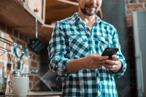 device, smartphone, digital, home, man, leisure, contraption, message, rest, comfort, technology, people, typing, young, brunette, male, caucasian, casual attire, delighted, domestic, innovative, always, connected, kitchen, progressive, contemporary, person, alone, adult, photogenic, good-looking, manhood, masculine, social, media, cyberspace, joyful, future, happy, relaxation, selective focus
