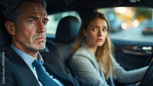 man, suit, car, driving, frustrated, expression, girlfriend, passenger, irritated, face, couple, vehicle, emotion, road, transportation, male, female, sitting, business, stress, journey, mood, commute, automobile, human relationships, tension, city, urban, interior, driver, frustration, travel, woman, interaction, angry, annoyance, love, facial, emotion, irritation, highway, modern, lifestyle, traffic, destination, trip, stressful, office