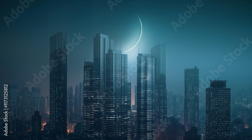 insomnia, night, city, skyline, crescent, moon, urban, skyscraper, mist, atmosphere, architecture, nightscape, light, evening, horizon, downtown, twilight, silhouette, tower block, building, modern, metropolis, blue, glasses, steel, shadow, dreamlike, nocturnal, city landscape, calm, serenity, dark, urbanisation, night time, landscape, district, structure, ambient, tranquil, glimmering