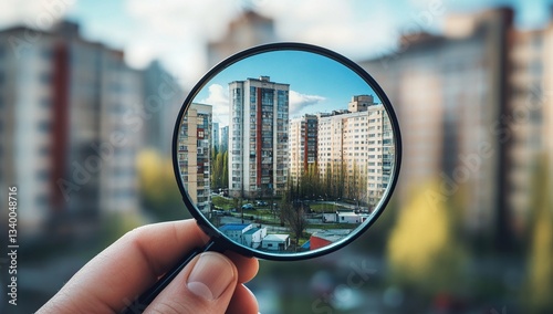 Inspecting Urban Apartment Buildings with a Magnifying Glass: Close-Up View of City Architecture Details, Revealing Hidden Features and Intricate Designs.
