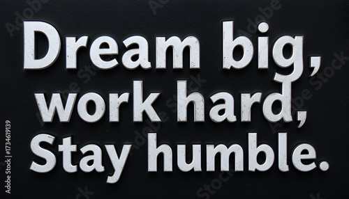 Inspirational text dream big, work hard, stay humble presented in clean, white, threedimensional lettering against a stark black background