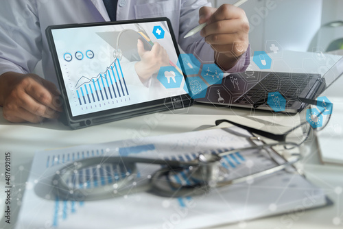 Insurance Healthcare Doctor analyzing medical report and medical on hospital background