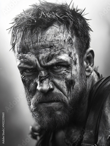 portrait, man, bearded, rugged, intense, black-and-white, closeup, dramatic, expression, dirt, weathered, tough, fierce, character, hero, cinematic, masculine, warrior, serious, emotion, strength, survival, grit, focused, determination, photo, art, realism, human face, appearance, lifestyle, adventure, storytelling, action, depth, contrast