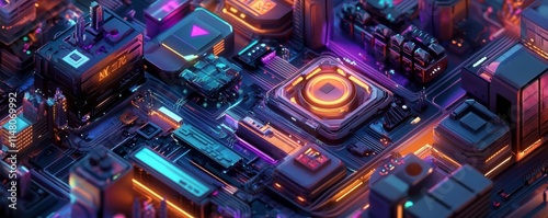 Intense colors and intricate designs evoke a sense of innovation and high-tech in this detailed isometric render.