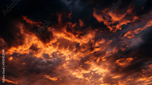 sky, cloud, sunset, orange, dark, red, dramatic, fiery, vibrant, twilight, evening, dusk, atmospheric, weather, storm, ominous, powerful, beautiful, nature, landscape, background, texture, abstract, intense, bright, colourful, horizon, cloudscape, majestic, awe, light, shadow, contrast, natural, grand, breathtaking, burning, glowing, high-coloured, heaven, thundercloud, altocumulus, cirrocumulus, dynamic, striking, celestial, epic, moody