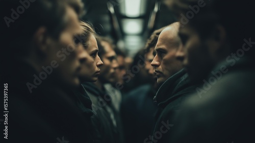 intense, gaze, crowded, subway, tunnel, people, facing, each, setting, urban, crowd, transport, city, shadow, expression, portrait, closeup, face, ambience, emotion, contrast, anonymity, humanity, travel, commuting, evening, atmosphere, connection, direction, sharpened, style, interaction, depth, mystery, crowding, public, transportation, underground, isolation, tension, mood, surreal