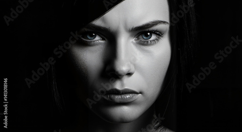 woman, intensity, determination, dark, eye, portrait, emotion, fierce, dramatic, strong, female, face, lighting, black-and-white, expression, model, serious, beauty, confidence, power, contemporary, art, emotional, closeup, artistic, mysterious, attitude, contemplation, mood, depth, sharpened, powerful, striking, character, modern, challenge, bold, identity, personality, strength, resilience, compelling, alluring