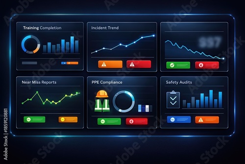 Interactive safety dashboard showcasing training completion metrics, incident trends, near miss reports, and compliance statistics with a focus on safety audits and risk management analysis