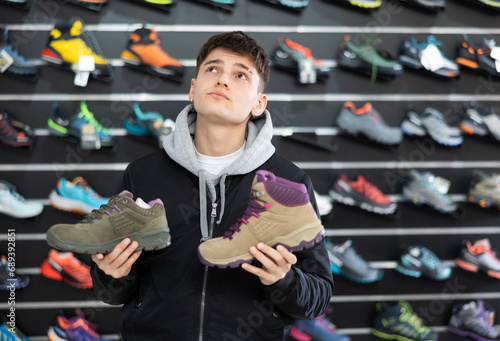 Interested male athlete chooses sports winter shoes for hiking in a sports store