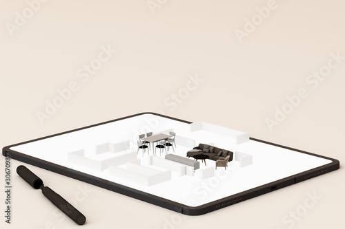 interior design concept: businessman with a tablet with interior design app on the screen. 3d rendering