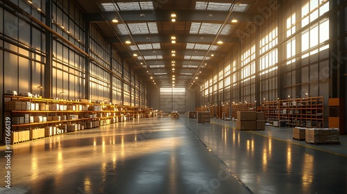 Interior design of an empty warehouse with sleek shelving units and a spacious, open-plan layout in 3D