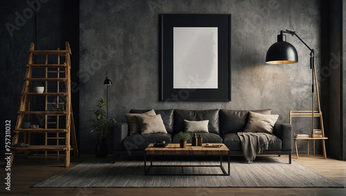 Interior design of living room with black poster mock up frame, shelf, wooden ladder , Grunge wall,Stylish home decor