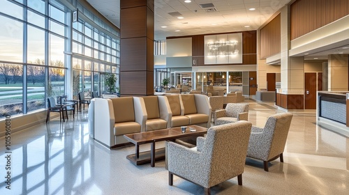 Interior hospital design with modern furniture, sleek architecture, bright lighting, and comfortable seating, highlighting functional healthcare spaces