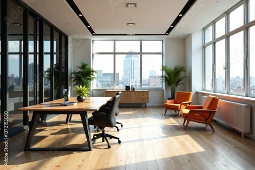 Interior of a sleek office space in London with stylish furniture and natural light, glass windows, contemporary, London