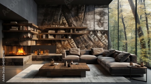 Interior of cozy living area in modern luxury cottage. Stone wall, corner sofa with cushions, rough wooden coffee table, fireplace, bookshelf. Panoramic window with forest view. Eco home design.