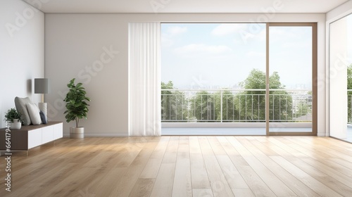 Interior of empty spacious living room with white walls and laminated floor with doors leading to balcony