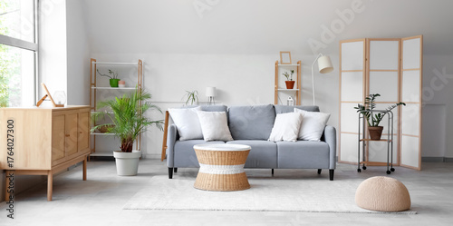 grey, interior, light, living, room, shelf, sofa, table, unit, apartment, background, carpet, chest, colours, comfort, commode, couch, decor, design, detail, domestic, drawer, element, fashion, flat, floor, folding, furniture, home, house, indoor, lamp, modern, nobody, object, palm, plant, pouf, rattan, relax, rest, screen, style, stylish, tree, trend, trendy, wall, white