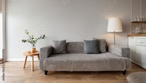 interior of living room modern style with grey fabric sofa wooden side table and white ceiling lamp on wooden floor