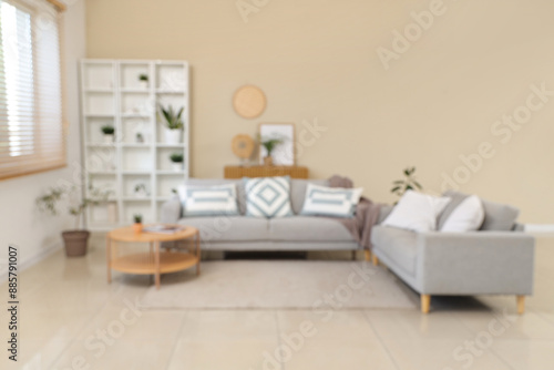 Interior of living room with comfortable sofa, coffee table, shelving unit and houseplant, blurred view