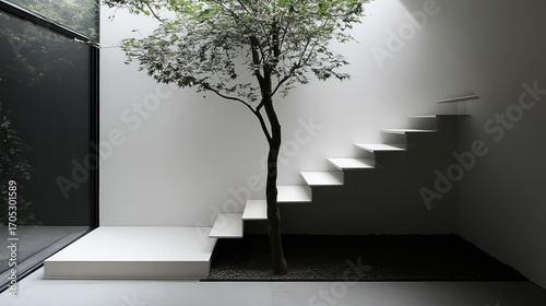 tree, stair, minimalist, interior, design, architecture, modern, white, light, shadow, growth, nature, concept, space, abstract, geometric, line, texture, contrast, clean, simple, building, house, home, plant, urban, window, room, environment, tranquil, peace, harmony, zen, garden, artistic, natural, balance, composition, style, perspective, structural, detail, contemporary