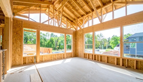 Interior view of a new house under construction. Sunlight streams into the open frame of the house