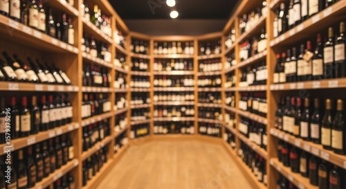 Interior View Wine Shop, Bottles on Shelves, Wooden Storage, Blurred Background, Alcohol, Retail