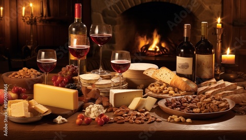 intimate, wine, cheese, tasting, culinary, fireplace, warm, ambience, assorted, article, epicure, platter, dining, luxury, comfort, cosy, indulgence, favor, texture, selection, variety, artisan, grape, nut, bread, bottle, glassware, candle, fire, glow, romantic, evening, relaxation, lifestyle, rich, savoury, elegant, atmosphere, hosting, life events, enjoyment, celebration, togetherness, gathering, hospitality, tradition, vintage, wood