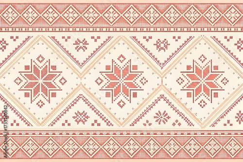 Intricate embroidered folk pattern with stars and geometric shapes creates a warm and inviting atmosphere for your designs, perfect for festive projects
