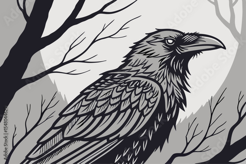 raven, gothic, bird, vector, illustration, design, intricate, detailed, dark, fantasy, mythical, creepy, halloween, black, red, yellow, cyan, magenta, artwork, graphic, vintage, symbol, crow, feather, wing, ornate, elegant, decorative, clip art, ai