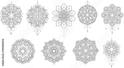 Intricate Grey Mandala Designs: Floral Patterns and Dangles