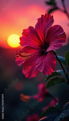 Intricate hibiscus silhouettes against sunset, vibrant hues, graphic, shape